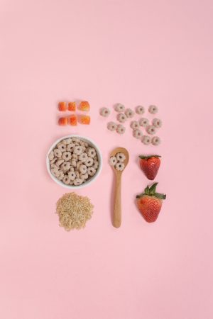 Brown jasmine rice. corn flour. rice bran oil. strawberry powder