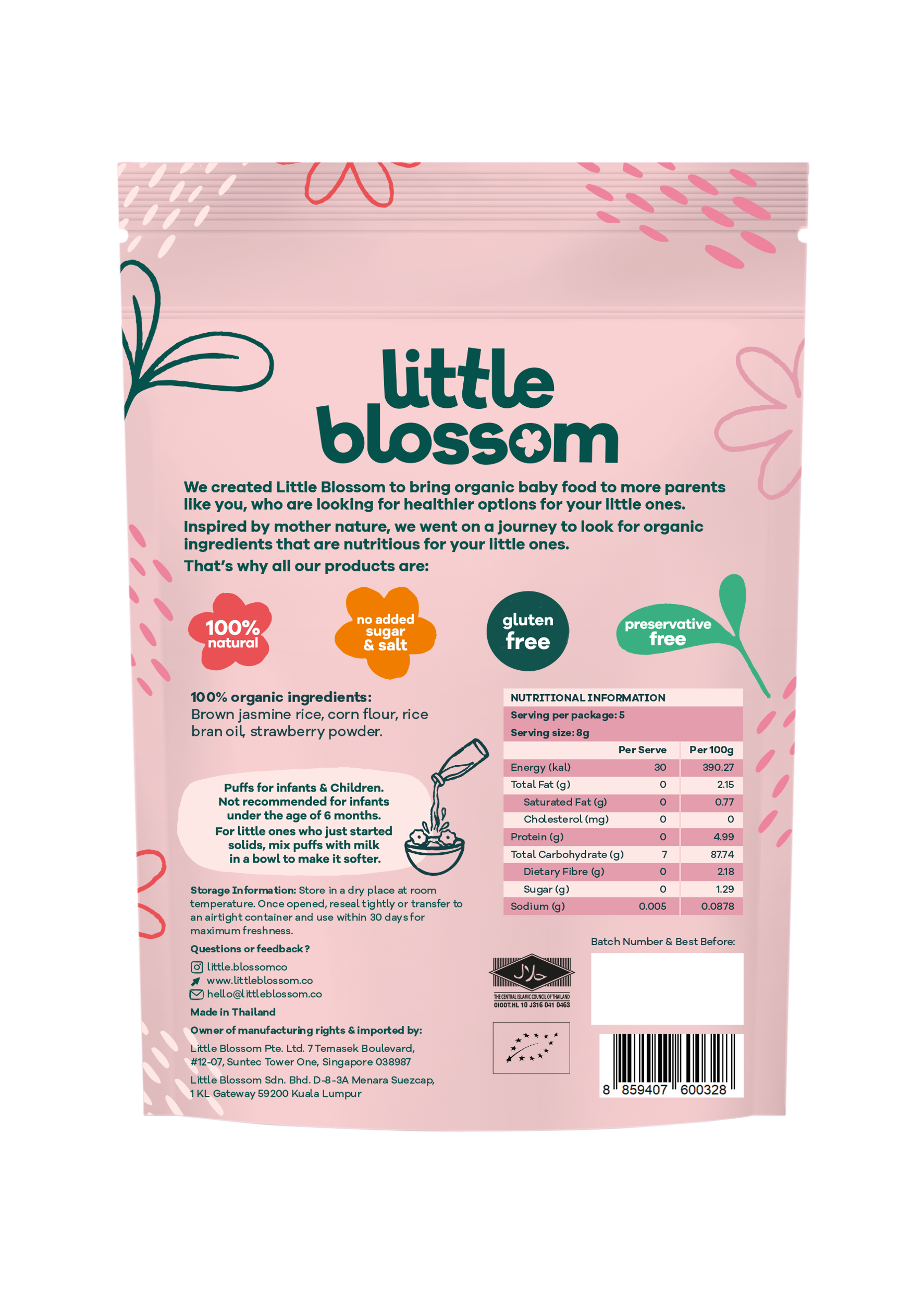 Little Blossom’s brown rice puffs are the perfect on the go snack for your baby! Our puffs are 100% natural. made with organic ingredients. contain no added sugar. salt or preservatives. halal certified and gluten-free.
