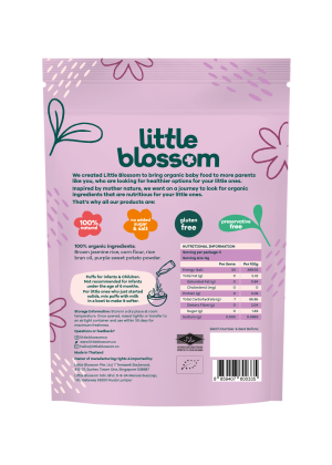 Little Blossom’s brown rice puffs are the perfect on the go snack for your baby! Our puffs are 100% natural. made with organic ingredients. contain no added sugar. salt or preservatives. halal certified and gluten-free.