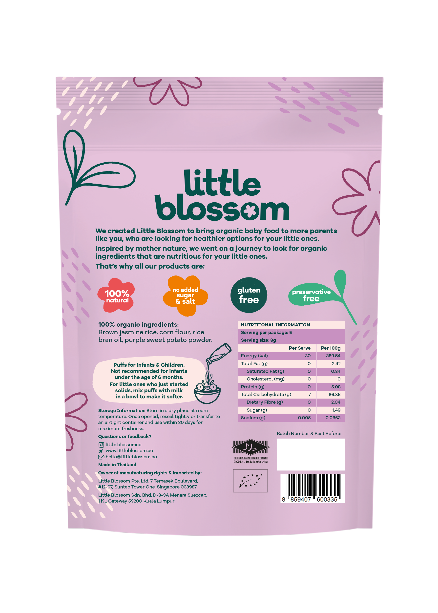 Little Blossom’s brown rice puffs are the perfect on the go snack for your baby! Our puffs are 100% natural. made with organic ingredients. contain no added sugar. salt or preservatives. halal certified and gluten-free.