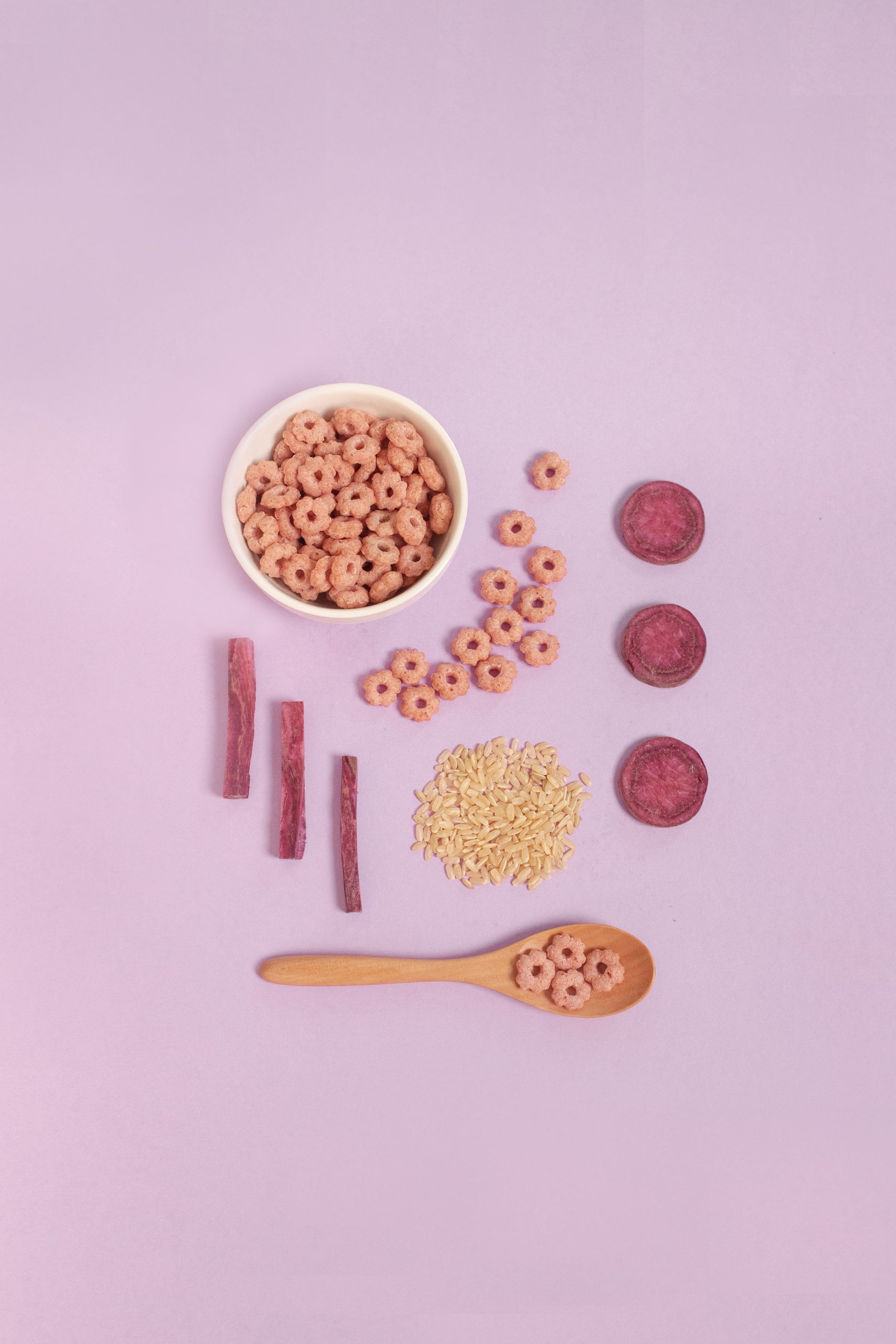 Brown jasmine rice. corn flour. rice bran oil. purple sweet potato powder